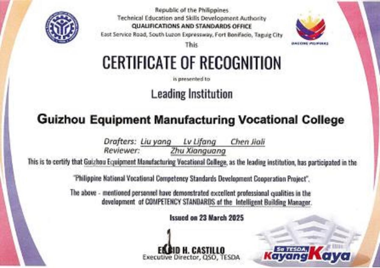 系部坚持以科研促教学、以创新助发展,引导教师聚焦产业前沿开展技术攻关。五年来,参与编制《贵州省城镇排水管道、检测与评估技术标准》等地方标准,获得《一种基于云平台的隧道通信监控系统》等5项发明专利授权并实现成果转化,发表学术论文多篇。积极践行“一带一路”倡议,牵头完成菲律宾国家职业技能标准《智能楼宇管理员职业技能标准》开发并交付,推动职业教育“走出去”,提升国际化办学水平。资政调研报告《警惕职教学生陷入“去技能化”陷阱》获贵州省委省政府主要领导肯定性批示,科研成果为区域建筑业发展提供了有力技术支撑。