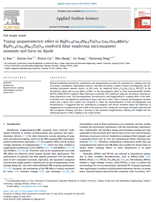 近日,我校与贵州大学合作在磁电器件方面取得进展,研究成果以“Tuning Magnetoelectric Effect in Bi6Fe1.6Co0.2Ni0.2Ti3O18/ La0.7Sr0.3MnO3/Bi6Fe1.6Co0.2Ni0.2Ti3O18 Sandwich Films employing Micromagnetic Moments and Force on Dipole”为题发表在Applied Surface Science(国际Top期刊,中国科学院一区)。论文第一作者为我校教师任丽(在读博士生)。