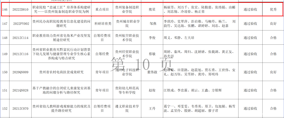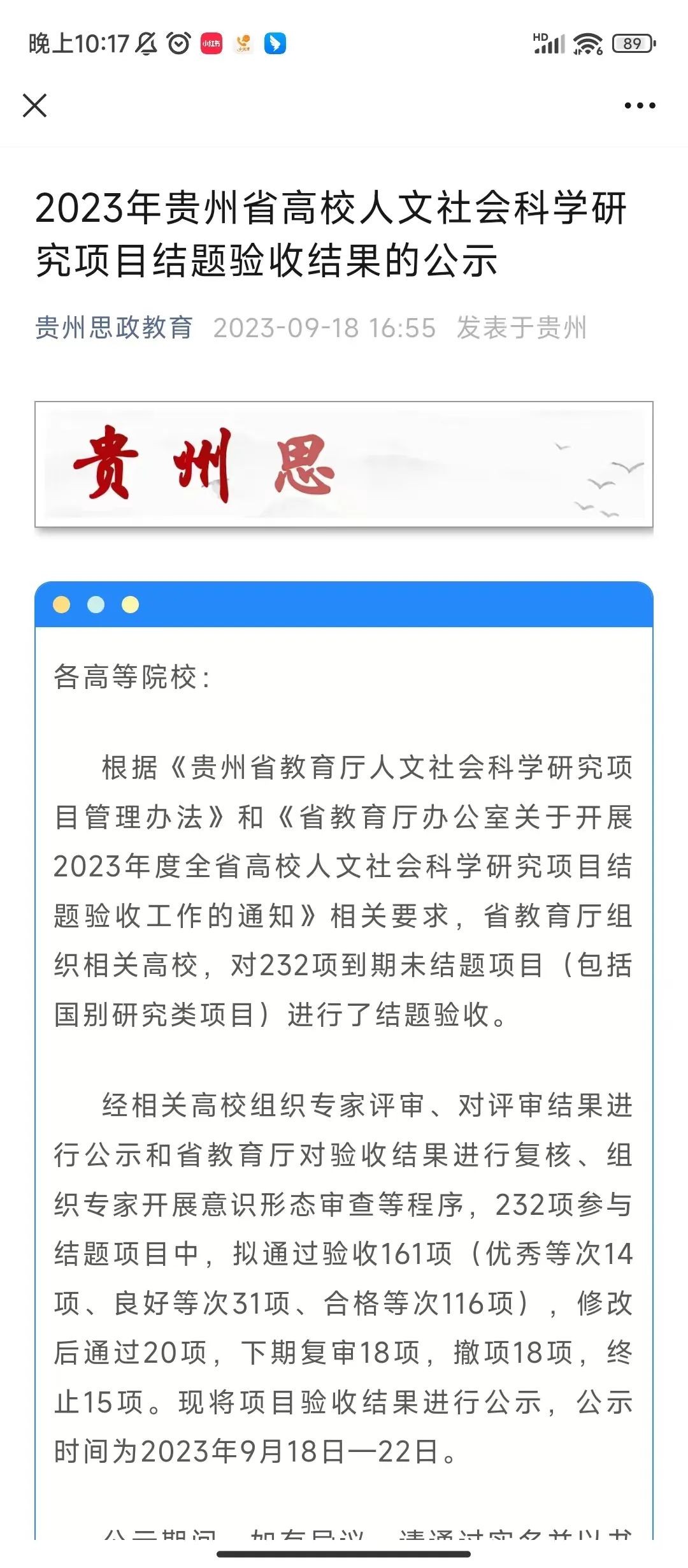 据省教育厅公示的2023年贵州省高校人文社会科学研究项目结题验收结果显示,学院党委书记熊星同志领衔完成的课题:《职业院校“忠诚工匠”培养体系构建研究——以优米app store为例》,获“优秀”等次。本次共232项课题参与结题验收,其中拟通过验收的161个课题中,获得“优秀”等次的项目仅14项。