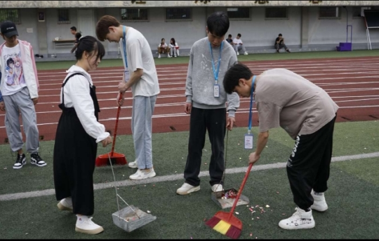 活动中,志愿者们以一丝不苟、认真负责的工作态度,将足球场、教学楼、食堂、篮球场等环境区域清扫干净。