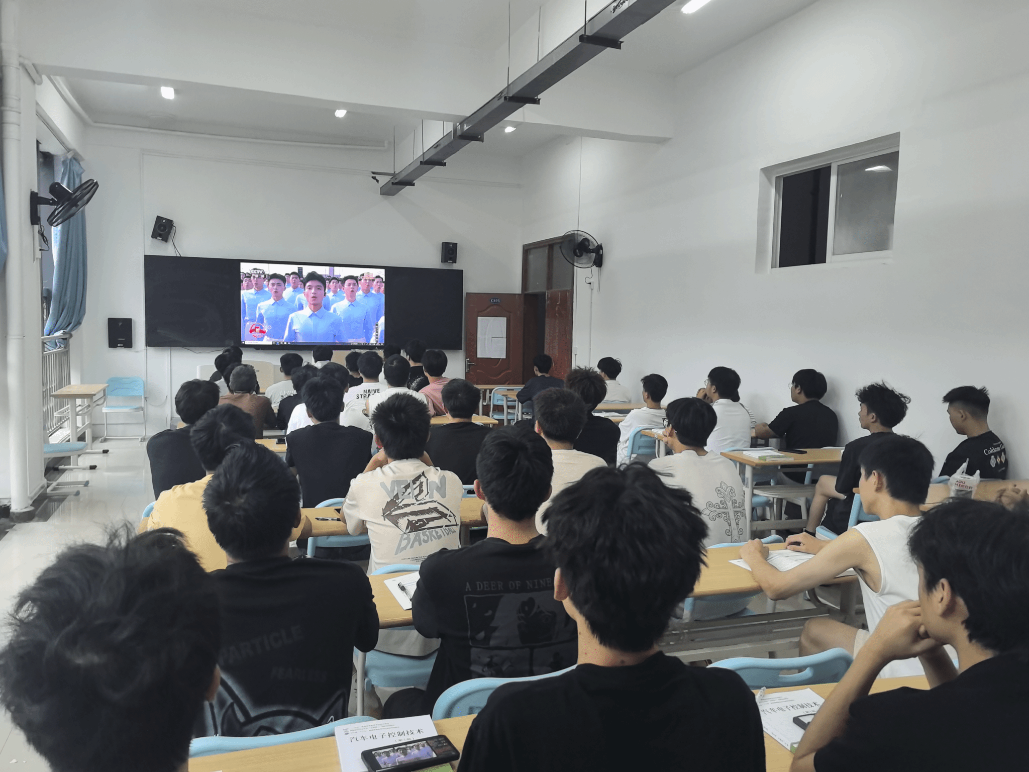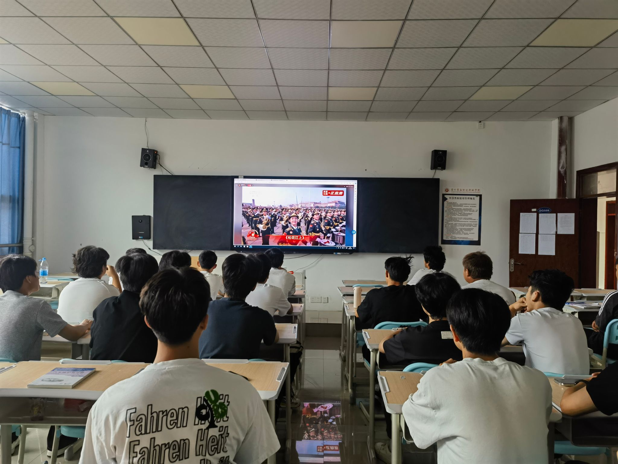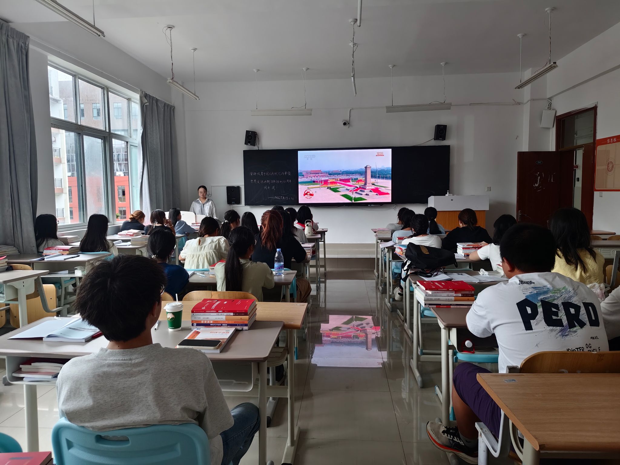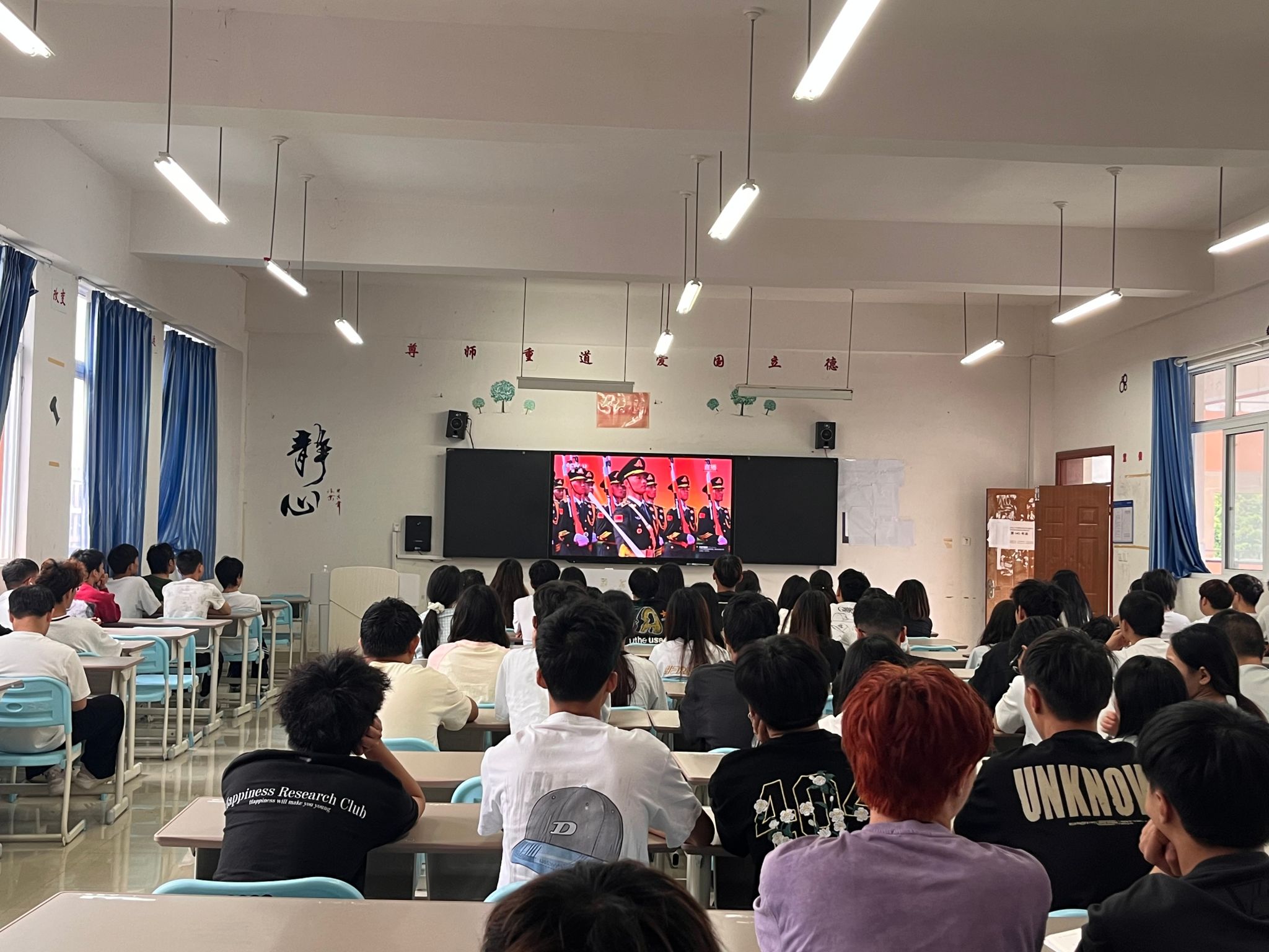 9月3日上午学校党委领导班子成员和全体教职工生齐聚在101会场和各教学楼教室,共同收看纪念中国人民抗日战争暨世界反法西斯战争胜利80周年大会直播。大会包括约70分钟的盛大阅兵。