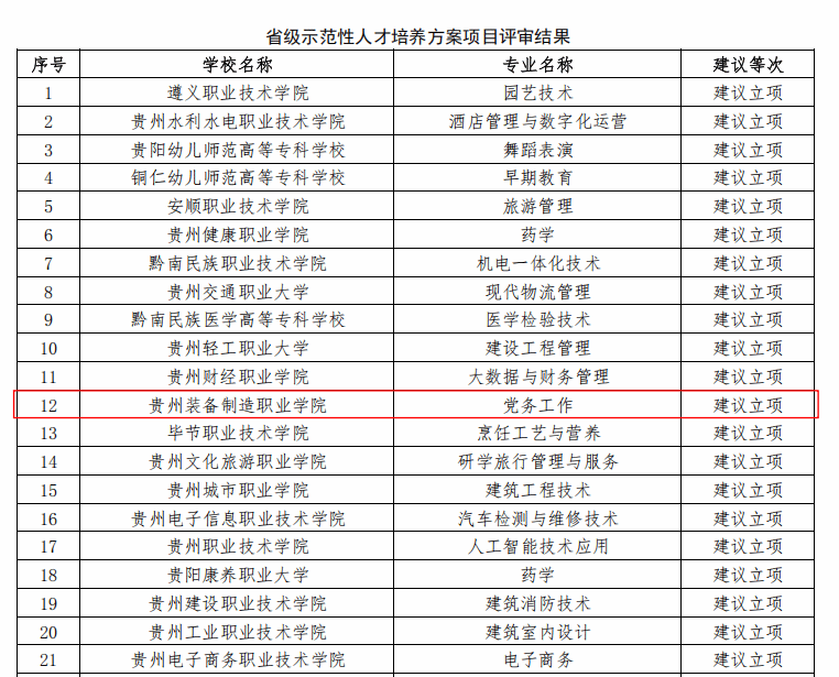 近日,贵州省教育厅公布2025下半年贵州省职业教育有关项目评审结果,继上半年“技能贵州”行动计划2个项目成功立项后,省级专业教学资源库、省级一流核心课程、省级重点(特色)专业、省级示范性人才培养方案4个项目喜获立项。截止目前,我院在“技能贵州”行动计划中累计立项项目32项。项目成功立项与建设,不仅是学院持续推进教师队伍建设的创新成果,也是对学院人才培养和教育教学改革成果的检阅和展示。