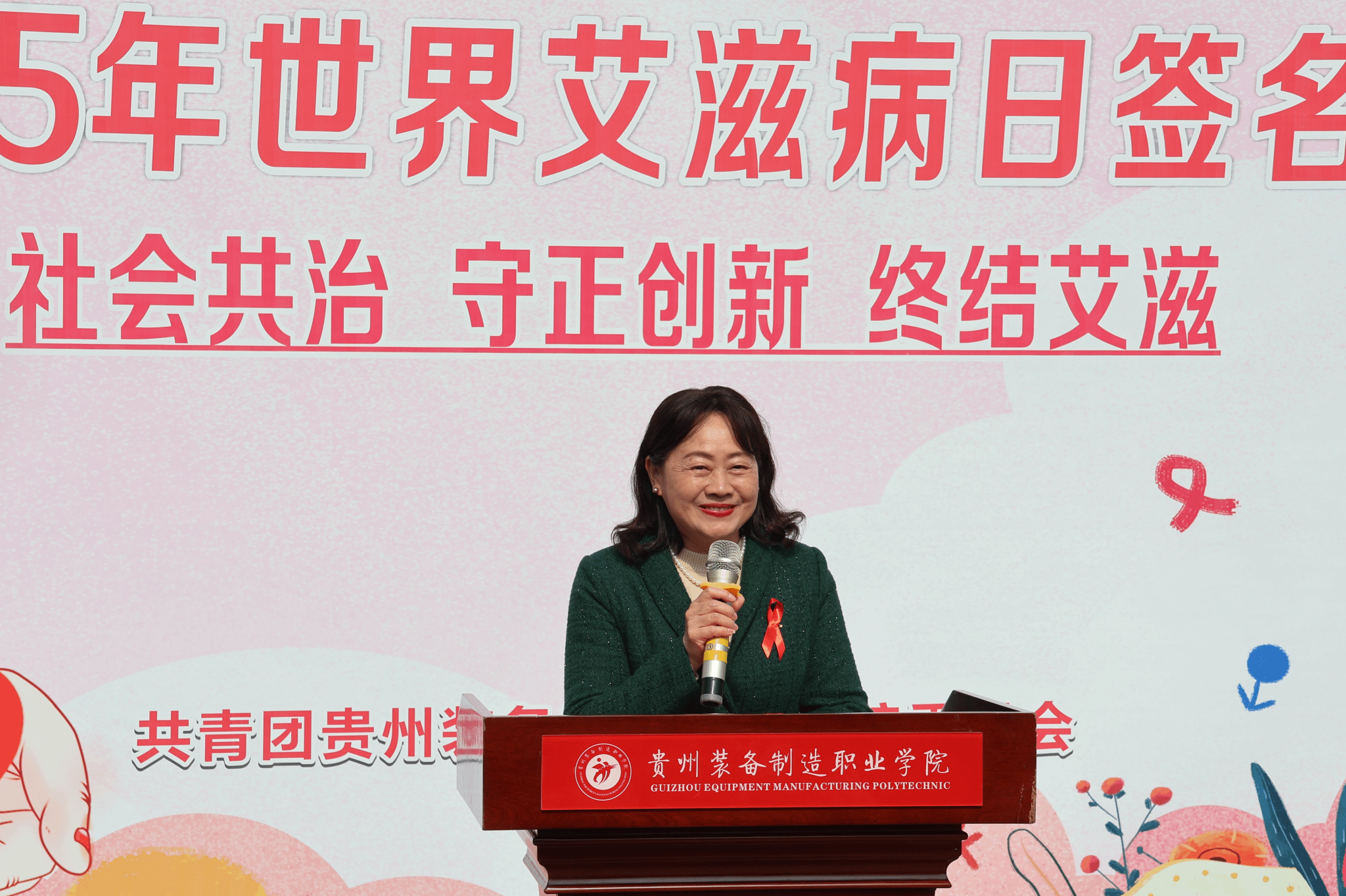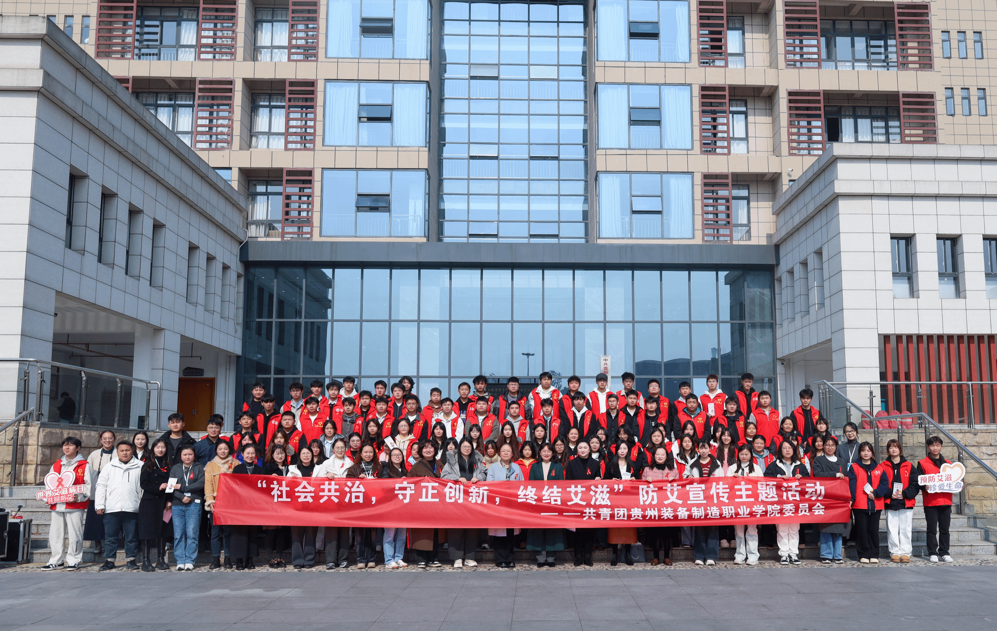 为进一步深化广大师生对艾滋病防治工作重要性与长期性的认识,持续推动学校防艾教育工作的常态化开展。12 月 1 日下午,在第 38 个 “世界艾滋病日”到来之际,由学院团委举办的 “社会共治,守正创新,终结艾滋” 防艾宣传教育活动在水景广场举行。学院党委副书记杨丽芳出席活动并致辞,各系部 300 余名师生代表参加活动,活动由团委书记孙文主持。