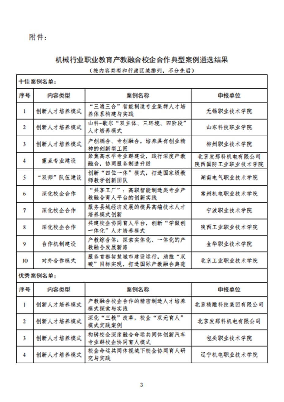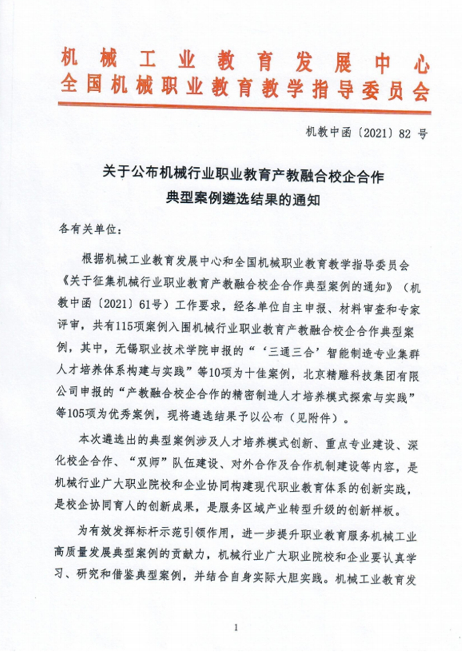 我校参加机械工业教育发展中心和全国机械职业教育教学指导委员会组织的职业教育产教融合校企合作典型案例申报,经材料审查和专家评审,共有115项案例入围机械行业职业教育产教融合校企合作典型案例,其中,我校申报的案例《校企合作开展基于3D打印的铝制品快速熔模铸造技术攻关》获优秀案例。