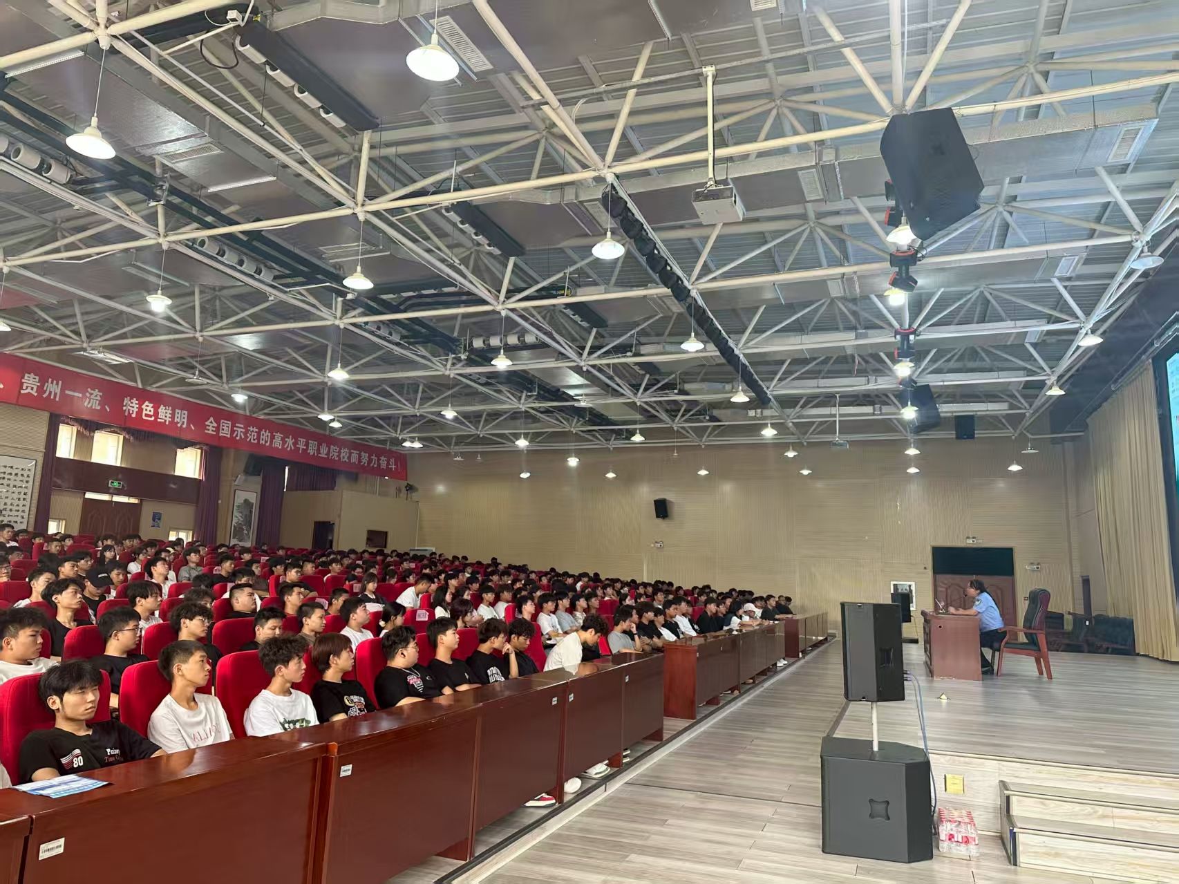 为贯彻落实《清镇职教城2025年秋季学期反诈护航行动工作方案》,提升2025级新生反诈能力,筑牢校园安全防线,我校昨日特邀清镇市公安局法治大队刘贤警官,在德润楼101会议室开展“反诈第一课”主题宣讲。本次讲座由保卫处工作人员主持,约400名学生宿舍寝室长参会。