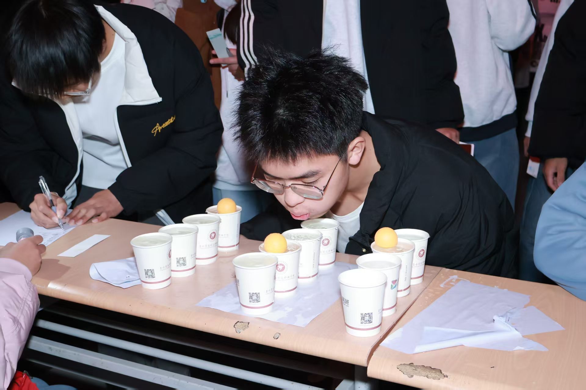 4行3列装满水的纸杯整齐排列,同学们仅靠气息掌控,将首个纸杯中的乒乓球依次吹至最后一个。乒乓球时而平稳前行、时而掉落,需要同学们不气馁、反复尝试。30秒内吹至终点或过4个及以上纸杯即可通关,3人同赛的热闹场景中,第四枚印章在欢声笑语中到手。