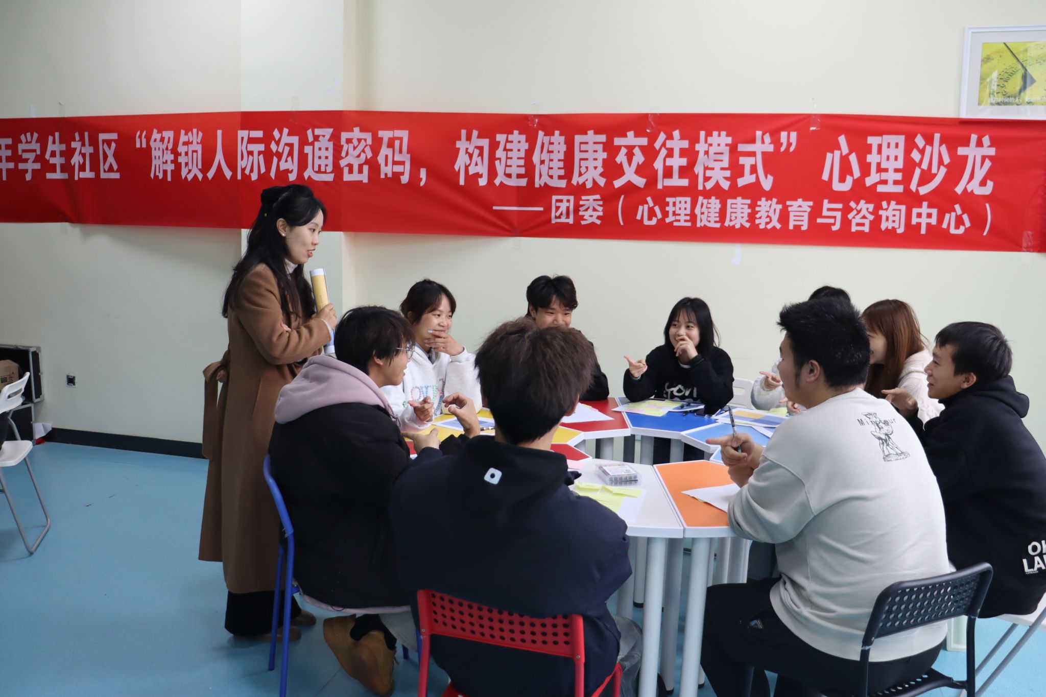 为进一步提升我校学生的人际交往能力,促进其心理健康发展。11月11日下午,学院(团委心理健康教育与咨询中心)邀请贵州省第二人民医院心理治疗师黄肖嘉棋在心理健康教育与咨询中心团体活动室举办了“解锁人际沟通密码,构建健康交往模式”主题心理沙龙活动。
